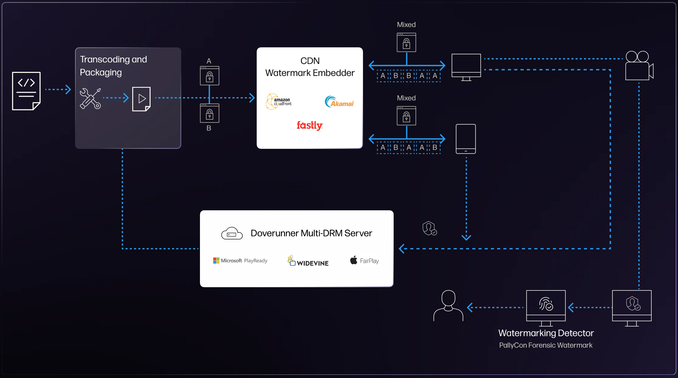 는 콘텐츠 트랜스코딩 및 패키징 기능과 콘텐츠 보안을 제공하는 클라우드 기반의 SaaS(Software as a Service)입니다. 원본 콘텐츠를 OTT 서비스에 적합한 DASH 또는 HLS 스트림 형식으로 변환하는 과정에서 선택적으로 멀티DRM과 포렌식 워터마킹을 적용할 수 있습니다.