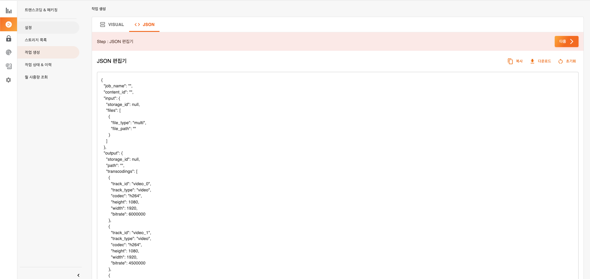 여러 원본 콘텐츠에 대해 동일한 설정으로 작업을 생성하려는 경우, 최초 등록한 작업의 세부 정보 페이지에서 복제 버튼을 클릭하고 2/6단계에서 입출력 파일을 변경합니다. 이후 단계에서는 복제된 설정이 자동 적용되어 다음 버튼을 클릭하기만 하면 새로운 콘텐츠에 대한 작업을 생성할 수 있습니다.