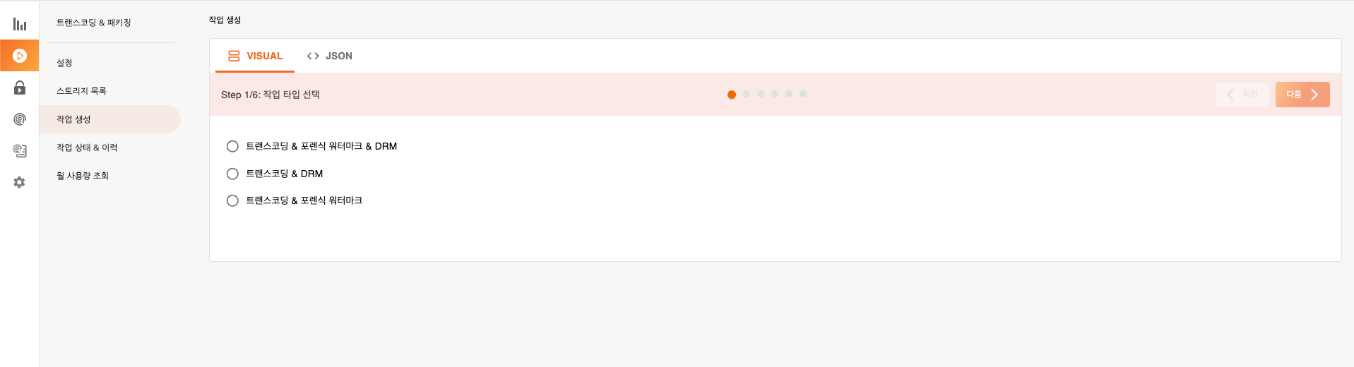 트랜스코딩 & 패키징메뉴에서작업 생성화면으로 이동합니다. - 작업 유형을