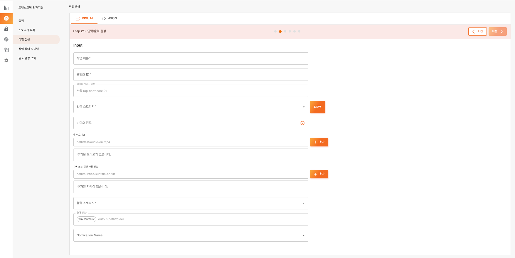 작업 이름: 작업을 구분하기 위해 임의의 이름을 입력합니다. (특수문자 및 공백 사용 불가, 최대 50바이트)콘텐츠 ID: 패키징할 콘텐츠의 고유 ID를 입력합니다. (특수문자 사용 불가, 최대 200바이트)입력 저장소 이름: 이전 단계에서 등록한 목록 중에 입력 저장소를 선택합니다.비디오 경로: 버킷 이름을 제외하고 저장소에 있는 소스 비디오 파일(mp4)의 경로를 입력합니다. (예:source/test1.mp4여기서source는 폴더 이름)추가 오디오: 추가적인 오디오 트랙의 경로를 입력할 수 있습니다.자막 또는 캡션 파일 경로: 자막과 함께 패키징하는 경우, 소스 영상과 동일한 입력 저장소에 언어별 자막 파일을 업로드한 후 해당 경로를 입력합니다. (WebVTT 자막만 지원)출력 저장소 이름: 목록에서 이전 단계에서 등록한 출력 저장소를 선택합니다.출력 디렉터리 경로: 최종 결과물이 업로드될 출력 폴더의 경로를 입력합니다.Notification Name: TNP 작업 상태 알림을 위해 구성된 알림 이름을 입력하세요.