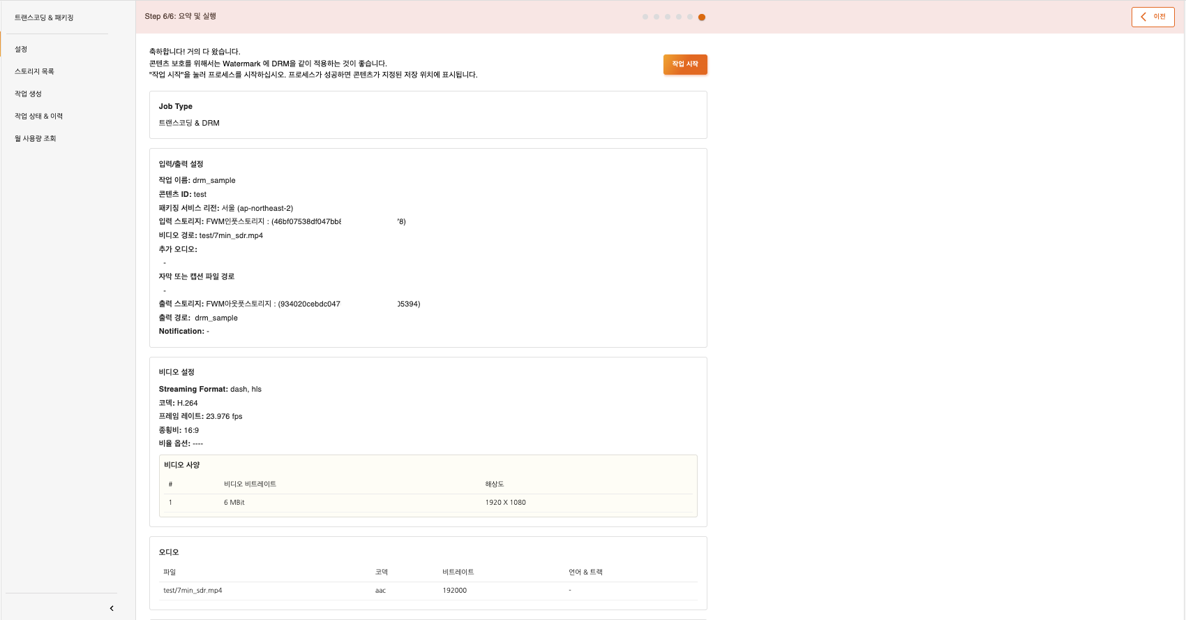 작업 유형이 트랜스코딩 & 포렌식 워터마크인 경우 DRM 설정 옵션이 생략됩니다.