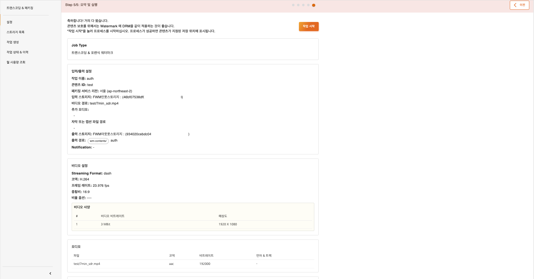 Section titled “3단계: 작업 생성”이 단계는 트랜스코딩 작업을 생성하고 콘텐츠 보호를 적용하는 주요 단계입니다. 도브러너 서비스의 구독 유형 및 콘텐츠 보안 요구 사항에 따라 포렌식 워터마킹과 멀티 DRM을 적용할 수 있습니다.